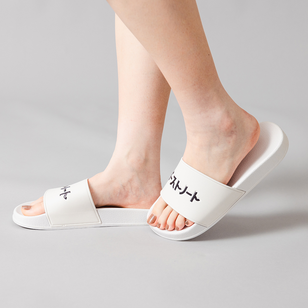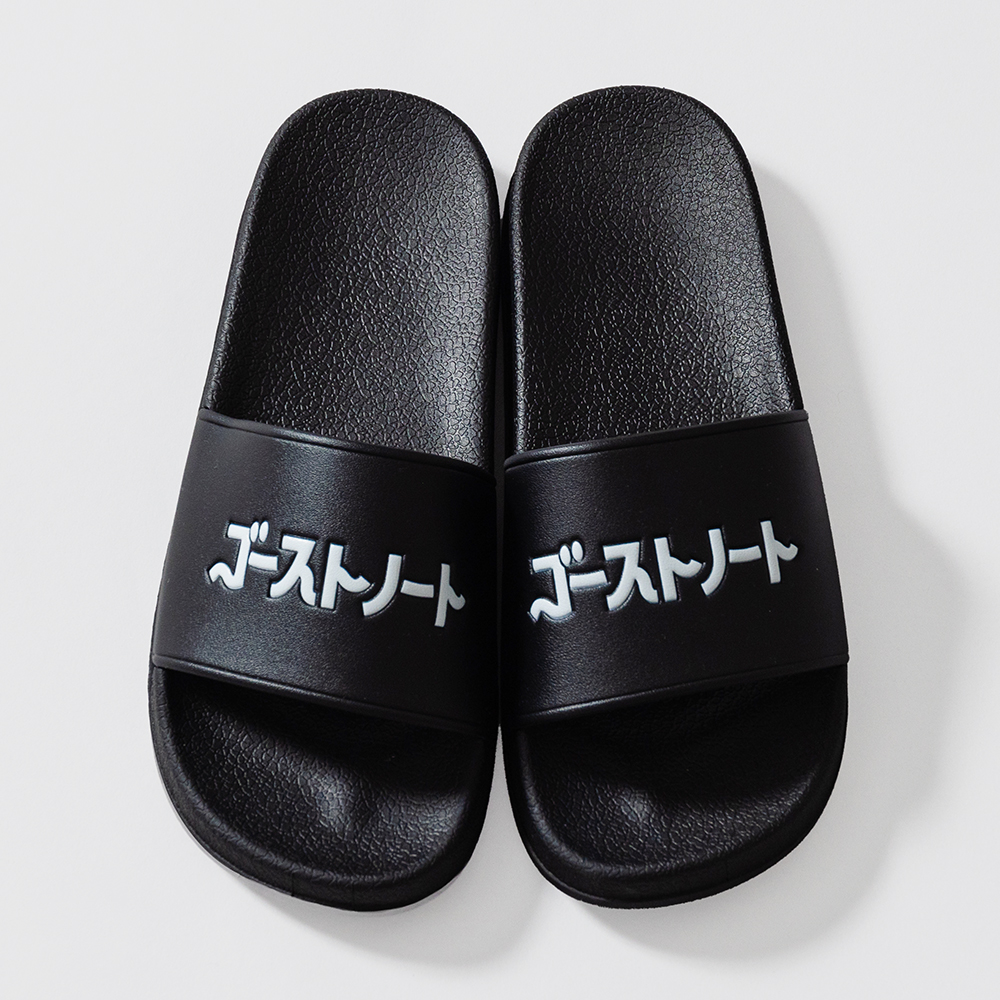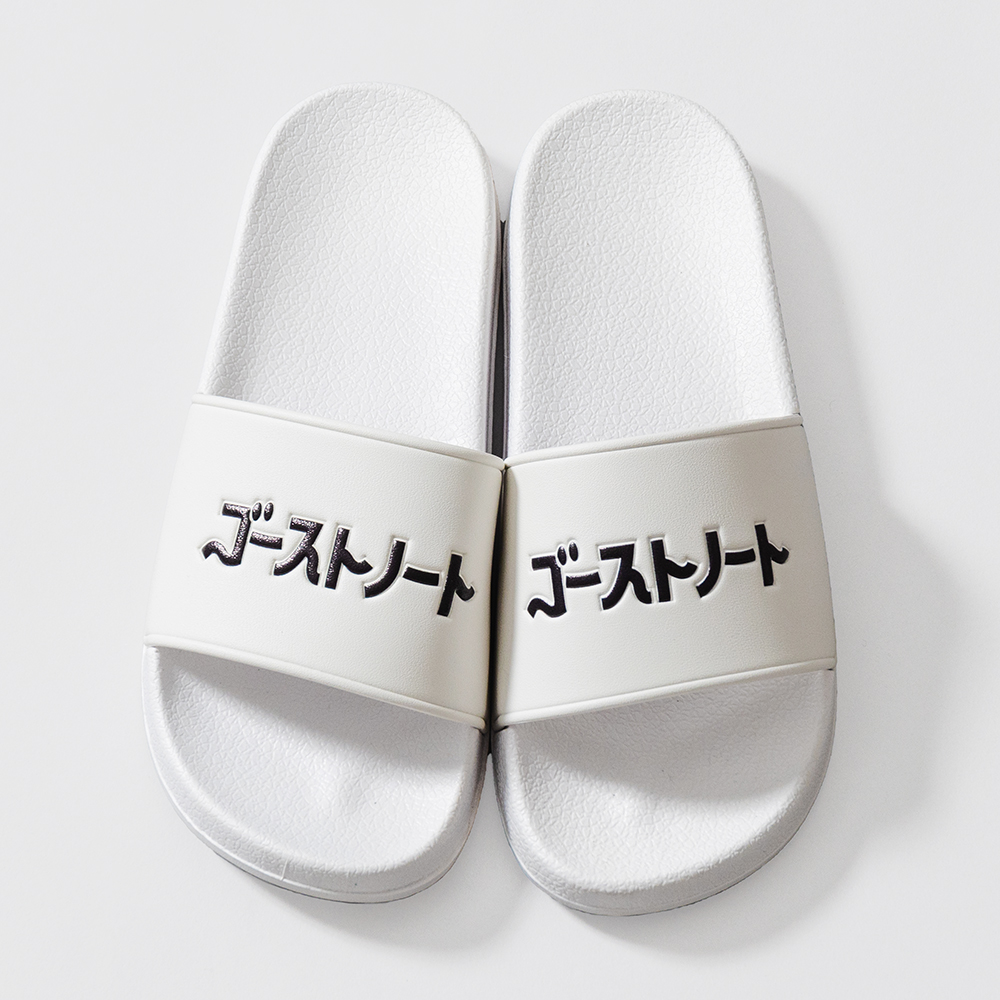 ゴーストノートサンダル ホワイト 在庫有り ¥3,000(税込) 数量12345678910 ブラック 在庫有り ¥3,000(税込) 数量12345678910 カタカナのロゴ文字はエンボス加工仕上げ。 シャワーサンダルですがルームサンダルとしても使えます。 正式な表記は27cmですが、体感としては24.5cm〜27cmくらいの足のサイズの方がいい感じです。 ポリ塩化ビニール素材。白と黒の2色。
